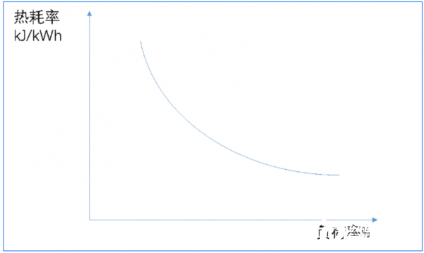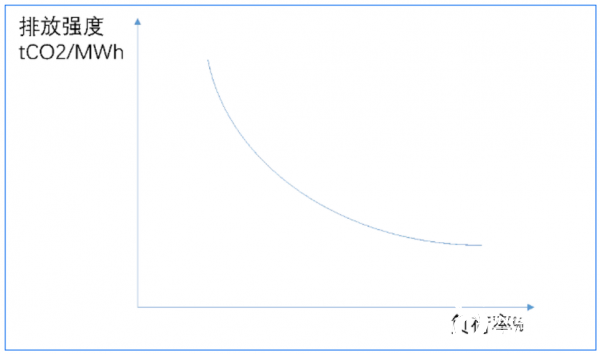 假设入炉煤低位发热量、入炉煤含碳量和入炉煤燃烧氧化率不随负荷变化,那么可以得到供电排放强度和负荷率的关系图: