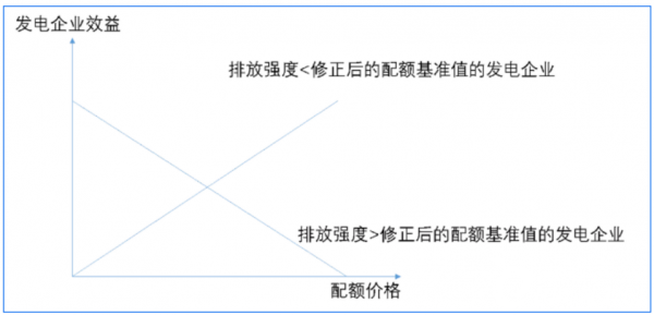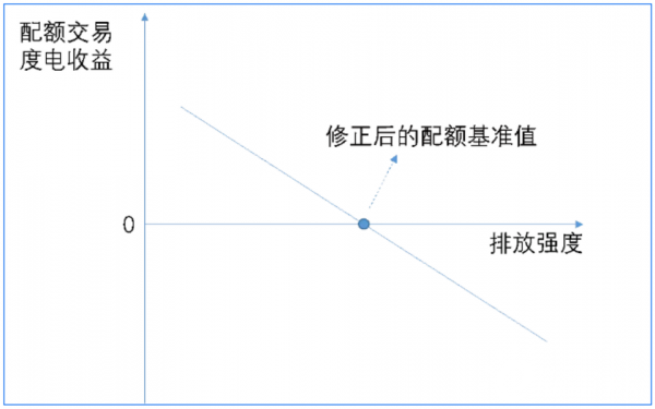 发电公司根据上网电量,计算免费碳排放配额(不考虑供热配额)。对于拥有先进技术的电厂,排放水平低于行业基准值,将产生富余配额,可以对外销售。排放水平高于行业基准值的发电公司,需要从市场上购买配额或颁颁贰搁,填补自己的碳配额缺口。发电公司配额交易度电收益和排放强度的关系如下图: