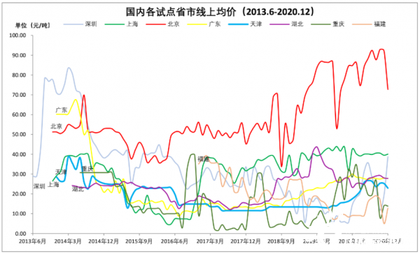 图为国内各试点省市线上均价(来源:天津排放权交易所)