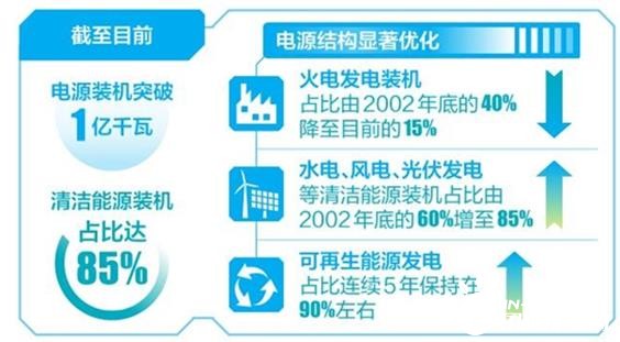 随着水电开发步伐的加快,全省电源结构显着优化。火电发电装机占比由2002年底的40%降至目前的15%,水电装机从2006年不足500万千瓦到2009年突破1000万千瓦。同年,清洁能源装机总量首次赶超火电的装机总量,占比达53%。截至目前,全省水电、风电、等清洁能源装机占比由2002年底的60%增至85%,水电成为发电“主力军”。