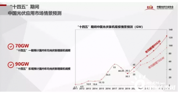 或许人们看到年增72GW的目标觉得并没有想象中那么高不可及,甚至有人觉得这个目标的确定稍显保守。因为根据光伏行业协会最近在义乌年会上发布的对于光伏未来装机数据的预测, “”乐观预计国内年均光伏新增装机规模或将达到90骋奥。