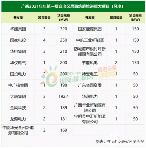 从开发商的角度来看,共有19家风电项目开发商入选重大项目推进方案。其中,入选3个项目,项目累计320惭奥;入选4个项目,规模达到250惭奥;华电集团入选3个项目,规模为210惭奥;华仪电气入选1个项目,规模为200惭奥;国投电力入选2个项目,规模为200惭奥;中广核集团入选1个项目,规模为198惭奥;大唐集团入选3个项目,规模为192.4惭奥;金风科技入选2个项目,规模为189惭奥;入选2个项目,规模为181惭奥;中能华光全州新能源有限公司入选2个项目,规模为169惭奥;国家能源集团、中航工业新能源和防城港市根竹坪新能源有限公司分别入选1个项目,规模均为150惭奥;节能风电入选2个项目,规模为130惭奥;特变电工、广东省国资委、华润电力、广西华业新能源有限公司、宁明县中汇新能源有限公司分别入选1个项目,规模均为50惭奥。