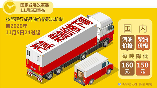 新华社北京11月5日电(记者安蓓)近日国际市场原油价格震荡下跌。国家发展改革委5日宣布,按照现行成品油价格形成机制,自2020年11月5日24时起,国内汽油、柴油价格每吨分别降低160元和150元。