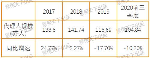 数据显示,平安人寿的代理人规模在2018年末达到141.74万人之后,就开始一路下滑,2019年末只剩116.69万人,同比下滑17.7%,2020年前叁季度更是只有104.84万人,同比下滑-10.2%。