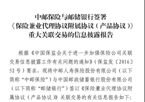 中邮人寿与第一大股东中国邮政储蓄银行(下称“邮储银行”)签署的《保险兼业代理协议附属协议(产物协议)》显示,截至2018年12月底,中邮人寿与邮储银行已发生关联交易金额累计574.7亿元,占2018年规模保费576.63亿元的99.67%。