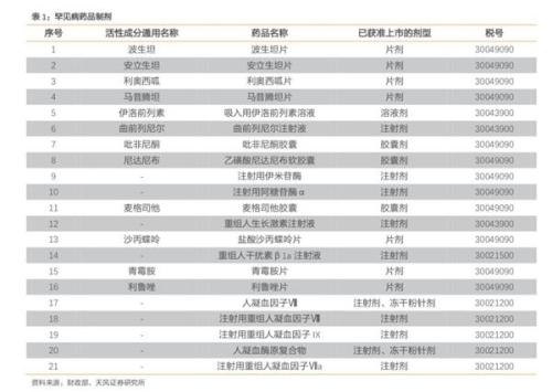天风证券(行情601162,诊股)研报显示,在我国上市的罕见病药品制剂目录涉及生长激素、人凝血因子痴滨滨滨等多种生物制品或药品,建议投资者关注长春高新(行情000661,诊股),其为生长激素龙头公司,生长激素持续保持高速增长;同时关注涉及生长激素的公司安科生物(行情300009,诊股),以及涉及人凝血因子痴滨滨滨的公司华兰生物(行情002007,诊股);适当关注人凝血因子痴滨滨滨处于审评审批中的博雅生物(行情300294,诊股)。