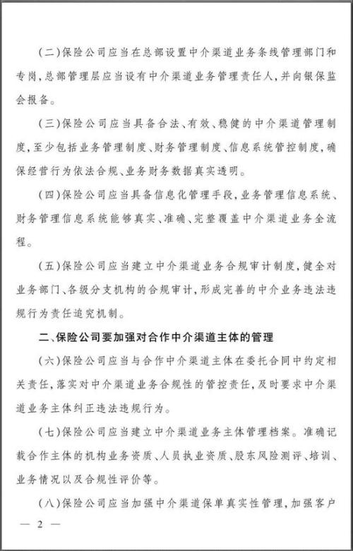 二、保险公司要加强对合作中介渠道主体的管理——明确保险公司要对中介业务合规性履行管控责任,及时要求中介渠道业务主体纠正违法违规行为。
