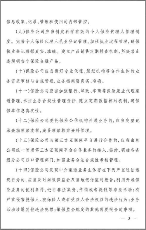 具体则包括加强中介渠道保单真实性管理,针对个人保险代理人、专业代理、经纪机构、银行、邮政、车商等保险兼业代理渠道以及保险公估机构、第叁方互联网平台等的合规性管理。