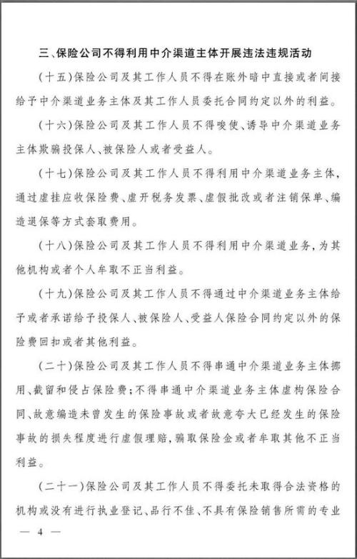 叁、保险公司不得利用中介渠道主体开展违法违规活动。在这部分中,《通知》明确禁止了几种保险公司与保险中介公司之间常见的违法违规行为,例如,给予中介合同约定以外的利益,通过中介返还保费或者给予客户其他利益,通过中介套取费用,保险公司员工与中介联手骗保等等,将几种常见的违规行为一网打尽。