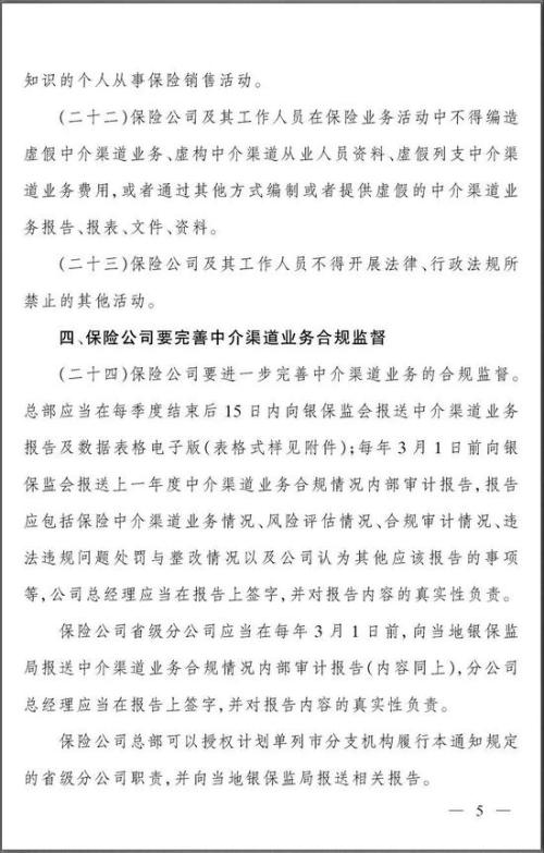 四、保险公司要完善中介渠道业务合规监督。《通知》要求,保险公司总部以及省级分公司每个季度以及每个年度都要按时报送中介渠道业务报告以及数据的电子版,并要求总公司总经理、分公司总经理在报告上签字,并对报告内容真实性负责。