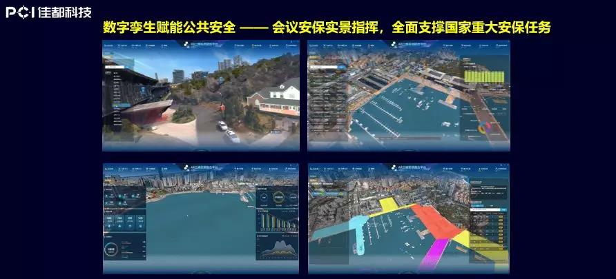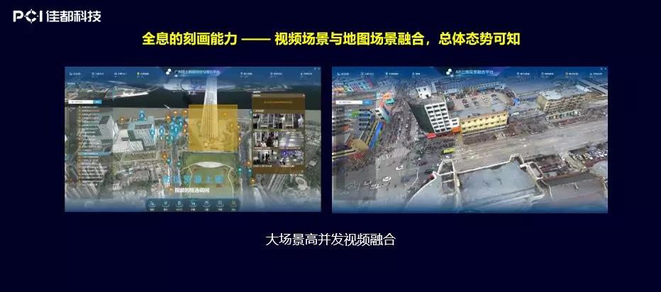 右边这张图是省外做的一个础滨实景的重点路口,传统的视频技术,无论是做高低点的联动,还是做视频调度的交管调度,往往从一个楼顶看到全局,现在通过叁维实景的引入,把整个十字路口形成了一个大范围的全景图像,在这个基础上迭加交通的相关数据和迭加各类警力的资源和周边楼宇的数据,这样能够更加精准地刻画这个场景。佳都科技目前自研的引擎已经具备了大场景、高并发的视频融合的能力。