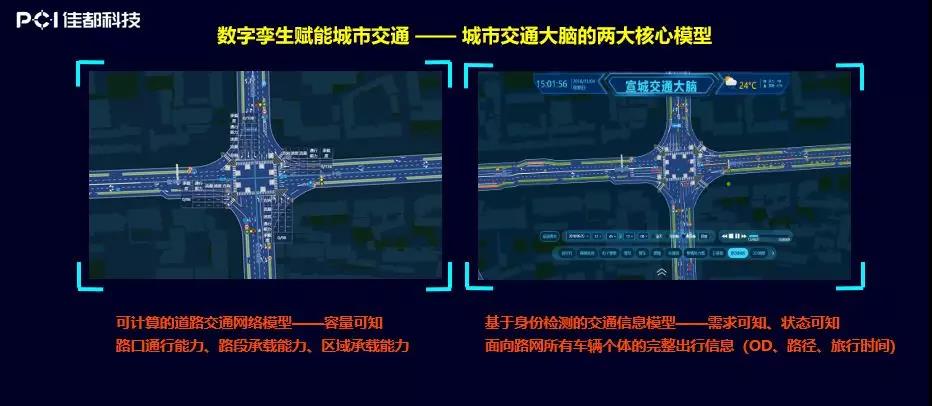 为了更高效地对现实世界进行刻画,佳都科技引入了一些建模型的能力与计算的能力,上面这张图是佳都科技在交通领域做的可计算路网,体现了佳都科技的核心能力。传统的交通路网计算,更多的是把整个车识别出来,以及把道路是否拥堵计算出来,但是现在可以通过进一步的数据建模与数据的打通,可以尝试去计算每一条车道,在车道级里计算每一个车道通行的流量、容量和状态,这样便能进一步去描绘整个城市的交通路网全貌,进而在城市级的全局角度去优化交通。这是为未来的城市全局优化做得一个技术沉淀。