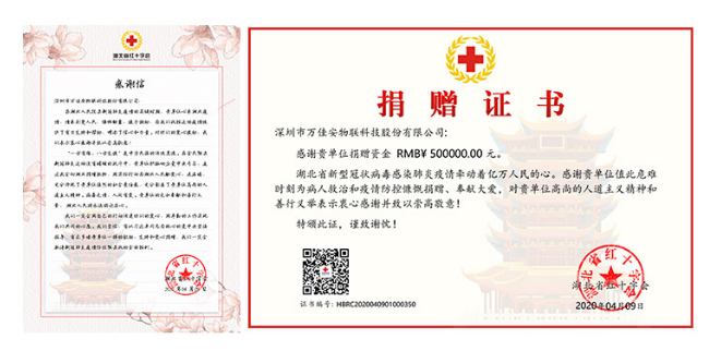 2月14日,万佳安集团董事长及高层领导共同发起,“携手共进·抗击疫情”专项募捐倡议书,为武汉及湖北等灾区人民开展专项募捐。万佳安集团董事长张能锋先生身先士卒,个人捐款人民币20万元整。万佳安人发扬人道主义精神和无私奉献精神,用行动凸显大爱情怀,纷纷慷慨解囊。截至3月中旬,募捐金额总计人民币50万元整,由公司行政部统一捐赠给湖北省红十字会。