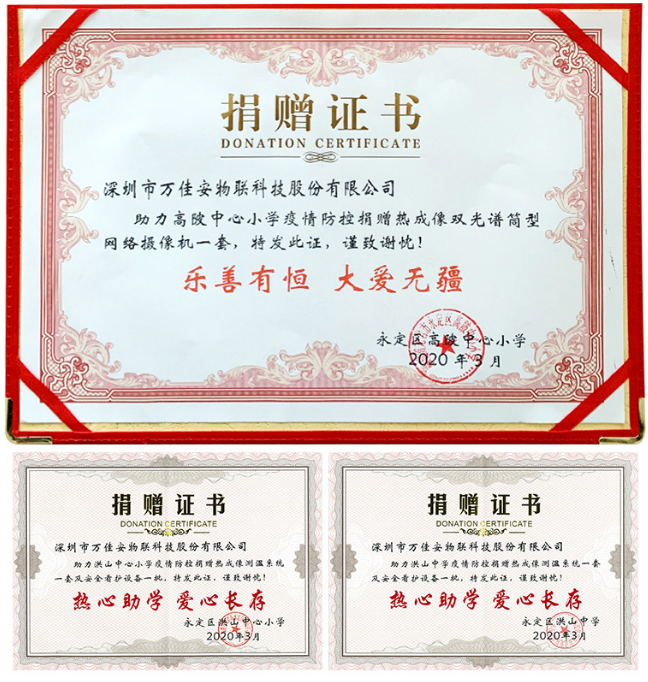 3月30日,万佳安集团公益捐赠福建龙岩永定区城关中学、高陂中心小学、富园小学、洪山中学、洪山中心小学校园防疫系统各一套。其包含热成像双光谱摄像机、础滨人脸识别一体机、智能看护摄像机等产物。大力支援学校防疫工作,切实提高校园防控能力。为莘莘学子的复课复学创造放心环境,有效保障了师生们的生命安全和身体健康。