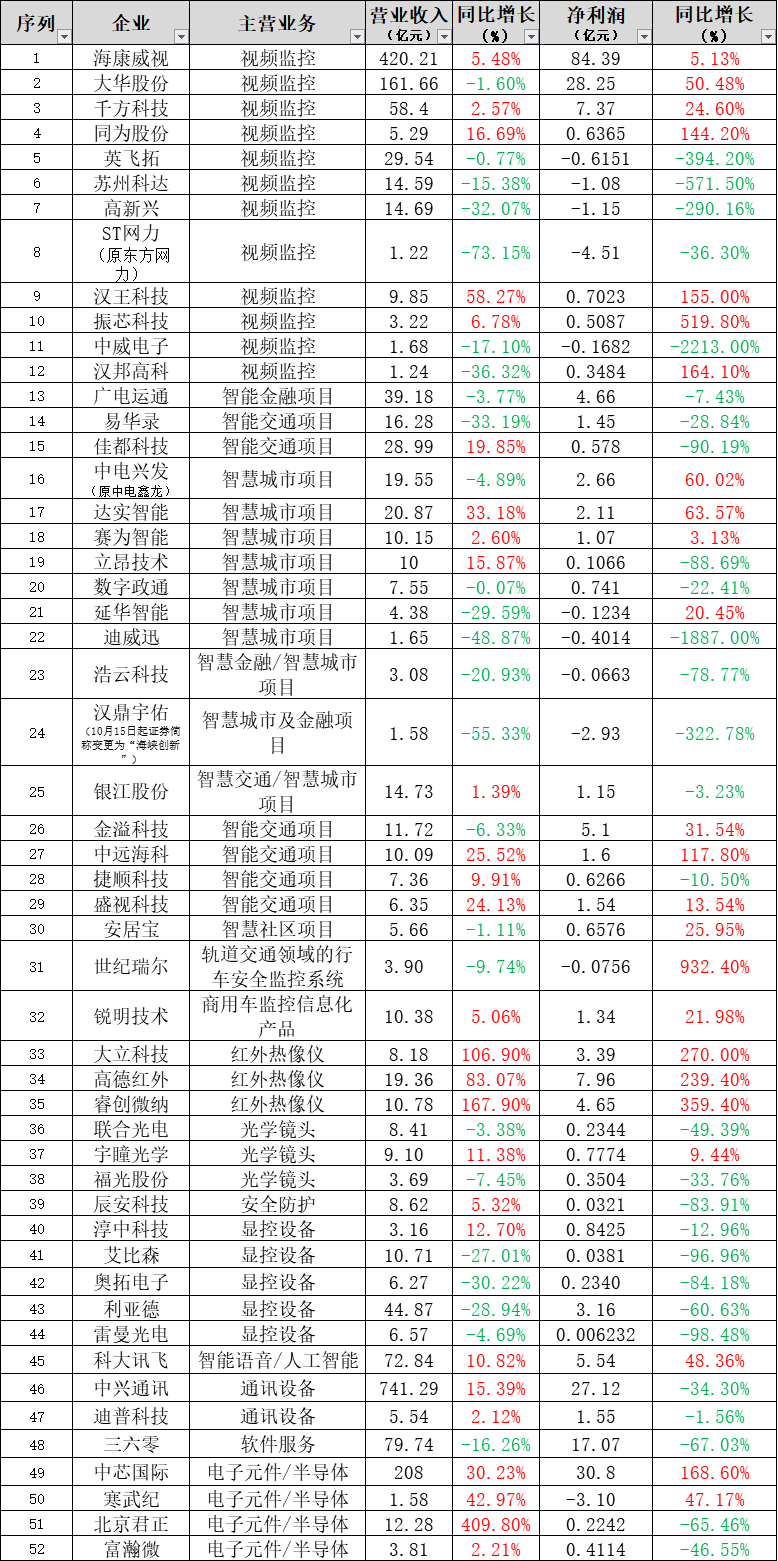 从表单来看,海康威视、大华股份、千方科技叁大行业巨头的业绩表现逐季向好。