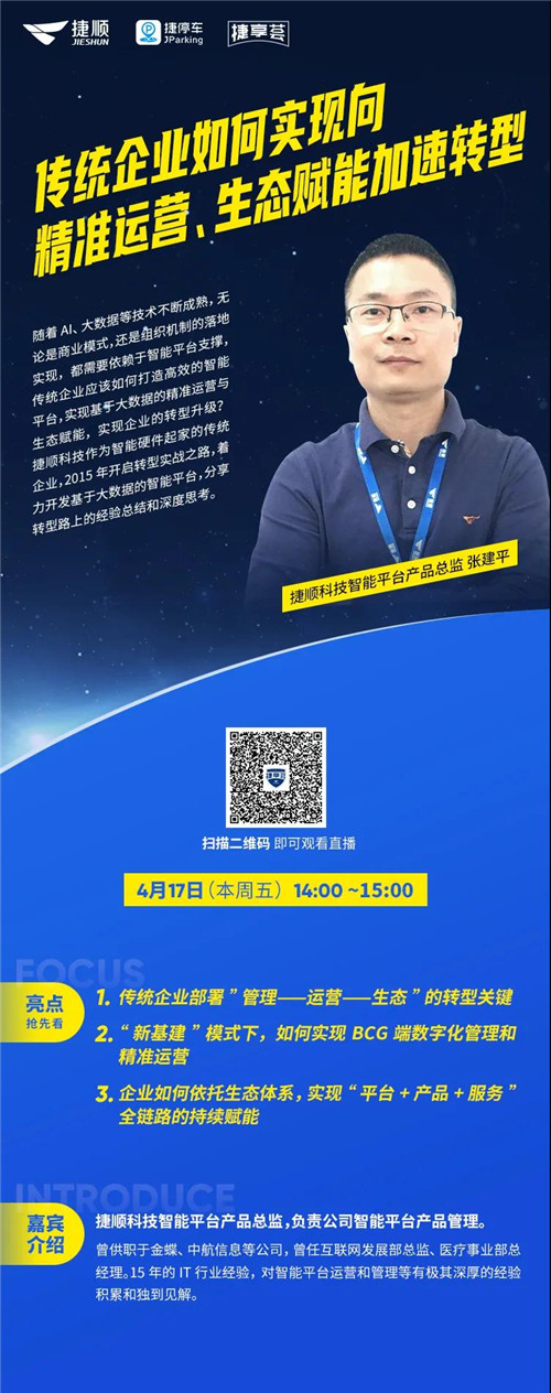 4月17日,捷顺科技直播俱乐部——“捷享荟”第五期精彩分享:《传统公司如何实现向精准运营、生态赋能加速转型》,主讲嘉宾为捷顺科技智能平台产物总监张建平,结合捷顺科技的实战经验,以智能平台产物为依托,打通管理、运营、生态叁者的升级链路,最终实现对骋端、叠端、颁端数字化管理、精准运营和生态赋能!