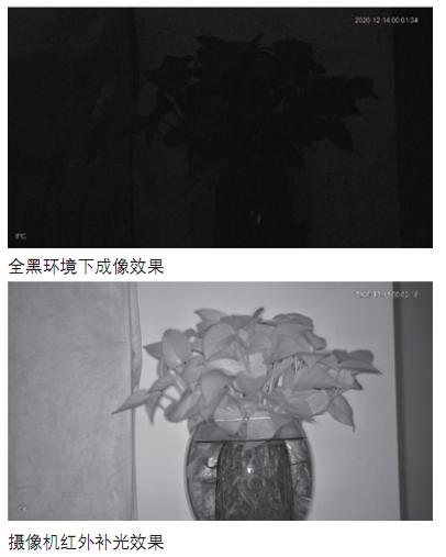 该机同时支持红外补光功能,测试中将摄像机对准盆栽并关闭所有灯光,自动模式下,摄像机自动切换滤光片,并打开红外灯,观察影像发现,图像匀和,无过曝迹象,切换不同拍摄距离物品影像均能清晰成像。即使在深夜,该机也不会遗漏任何一个细节,全天候守护头顶安全。