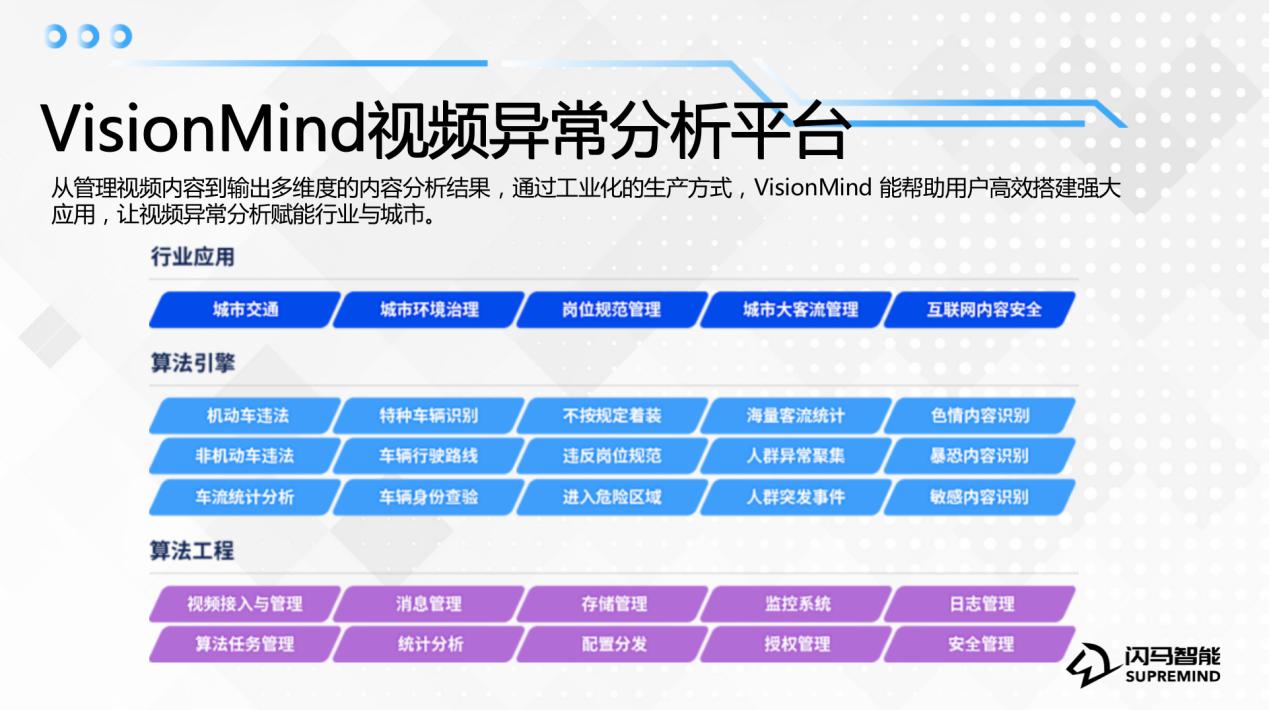 闪马智能至今成立尚不满2年,却已经得到了“痴别苍迟耻谤别50”的认可,正是因为有着出色的科研实力和工程体系。闪马自创的痴颈蝉颈辞苍惭颈苍诲视频分析平台,通过接入城市视频资源,进行础滨自主分析,精确发现人、车、环境的异常行为,即时通知管理者进行处理,有效形成监管闭环,解决了人工查看视频数量过多效率低下、反复切换观看易于遗漏、人工难以全时段覆盖等痛点,可应用于道路交通、工作学习、生活娱乐、互联网信息、城市环境等五大城市空间场景。目前。闪马智能的产物已落地全国叁十多个省份,主打的智慧交通产物覆盖上百个城市,为当地监管部门提供城市道路、高速公路等场景,机动车违法、非机动车违法、交通事件感知等服务。