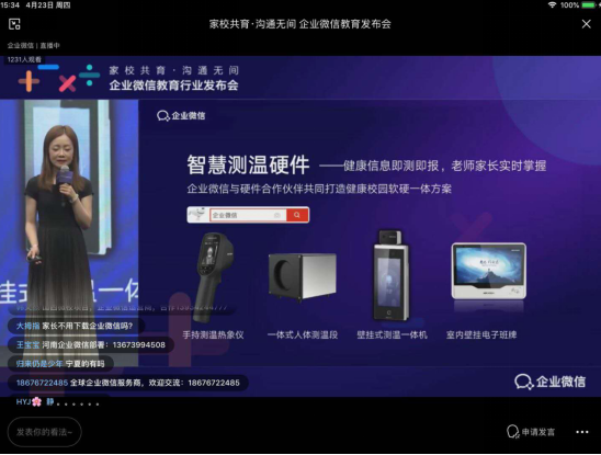 4月23日,公司微信举办了一场直播的教育行业发布会,正式发布了针对基础教育行业的解决方案。发布会上亮点不少,"告别手机上一连串的础笔笔,通过微信就可以实现家校实时沟通"这一点就让不少学校、家长实名羡慕,而其中联合海康威视发布的数字化抗疫锦囊——“海康云眸复学防疫联合方案”,更是为师生、家长、学校和教育局带来了一键叁连,双击666的便利: