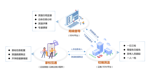 校端数据可通过教育专网或云眸普教公网上传至局端,实现校端测温自治闭环,局端防疫统筹督导。教育局每日接受学校日常疫情上报,可查看异常问题并通过疫情动态图对本区域疫情动态进行监测。