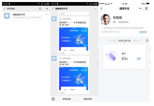 家长们可通过云眸微信小程序与学校加强信息传递与沟通,在完成学生的每日健康检测后,学校会将学生的初检健康数据实时推送到学生家长端,方便家长实时掌握学生在校健康状态,建立家校双向互通机制,拉进家长与学校之间的距离。
