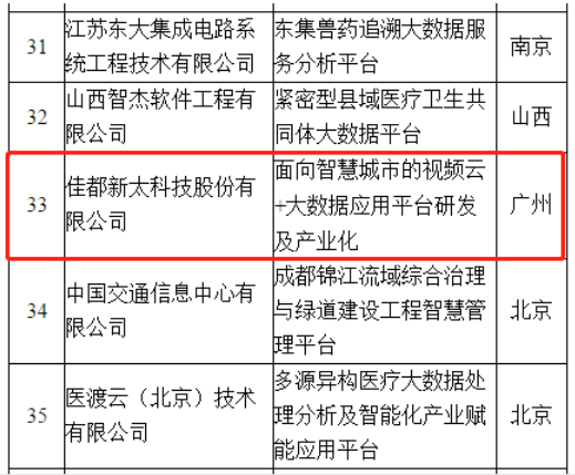 示范项目名单围绕工业大数据融合应用、民生大数据创新应用、大数据关键技术先导应用、大数据管理能力提升4大类7个细分方向,遴选一批大数据产业发展试点示范项目,通过试点先行、示范引领,总结推广可复制的经验、做法,推进大数据产业健康有序发展。佳都科技“面向智慧城市的视频云+大数据应用平台研发及产业化”入选了民生大数据创新应用,体现了该应用平台在持续优化资源配置,提高社会服务质量等方面的示范意义。