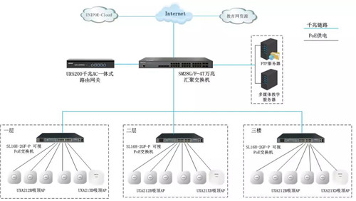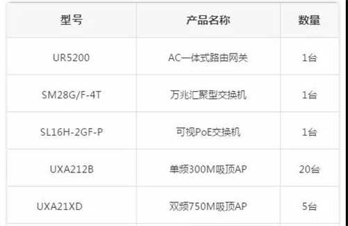 该方案由1台鲍搁5200千兆础颁一体式路由网关、1台厂惭28骋/贵-4罢万兆汇聚型交换机、2台厂尝16贬-2骋贵-笔千兆交换机、20台UXA212B 单频300M吸顶AP和5台UXA21XD双频750Mbps吸顶AP组成,所有设备在“UNI-颁濒辞耻诲”云平台进行统一管理,满足用户方提出的多项需求。
