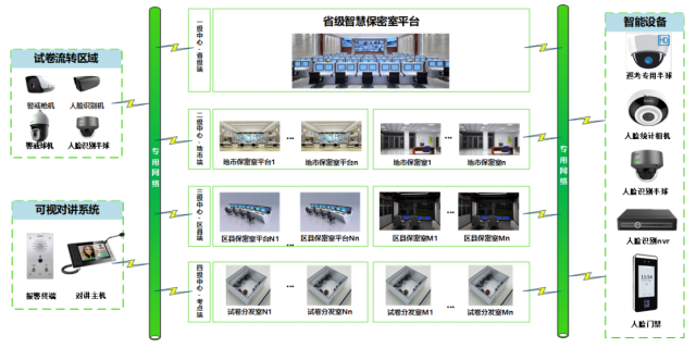 智慧保密室系统采用多级联网架构,实现校级、区县、市级和省级的层层监管。