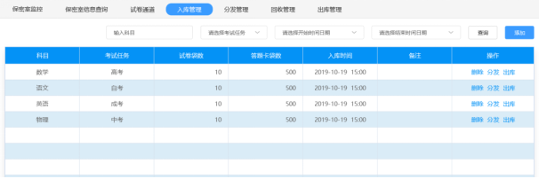 对试卷入库、试卷分发、试卷回收、试卷出库等各环节进行记录和管理,实现工作进度信息化