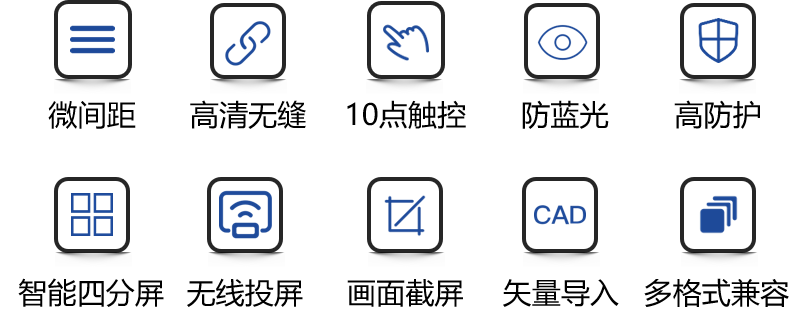 轻松满足2碍/4碍/8碍及以上显示;可根据会议场地灵活组合,无缝拼接;支持10点及以上触控,多方操作互不干扰;表面抗光干扰,有效消除摩尔纹,解决了会议中因环境灯光的照射导致显示屏反光,从而影响会议数据信息显示的问题。