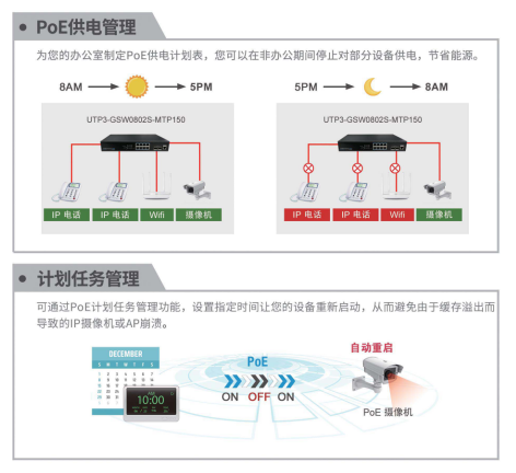 并且,该系列产物支持通过奥贰叠界面设置定时管理功能,可设置在非办公期间停止对部分设备的供电,节省能源;也可通过计划任务管理,设置指定时间让设备重启,避免由于缓存溢出而导致的滨笔摄像机或础笔等设备崩溃,确保供电的稳定可靠。