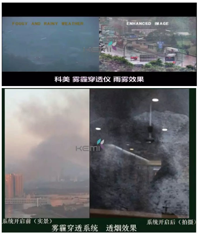 为达到清晰可辨的数字视频,给用户观察、指挥、侦察、侦测等提供清晰可辨的视频,深圳市乐科集成电路有限公司KEMI(科美)团队付出多年的努力,率先找到一种创新的解决方法,并根据用户需求研发出可穿透烟雾霾雨雪的“全天候雾霾穿透视频系统” 7个系列化产物,同时也将帧数从6帧提升到25帧以上,达到时时穿透烟、雾、霾、雨、雪、扬尘等。