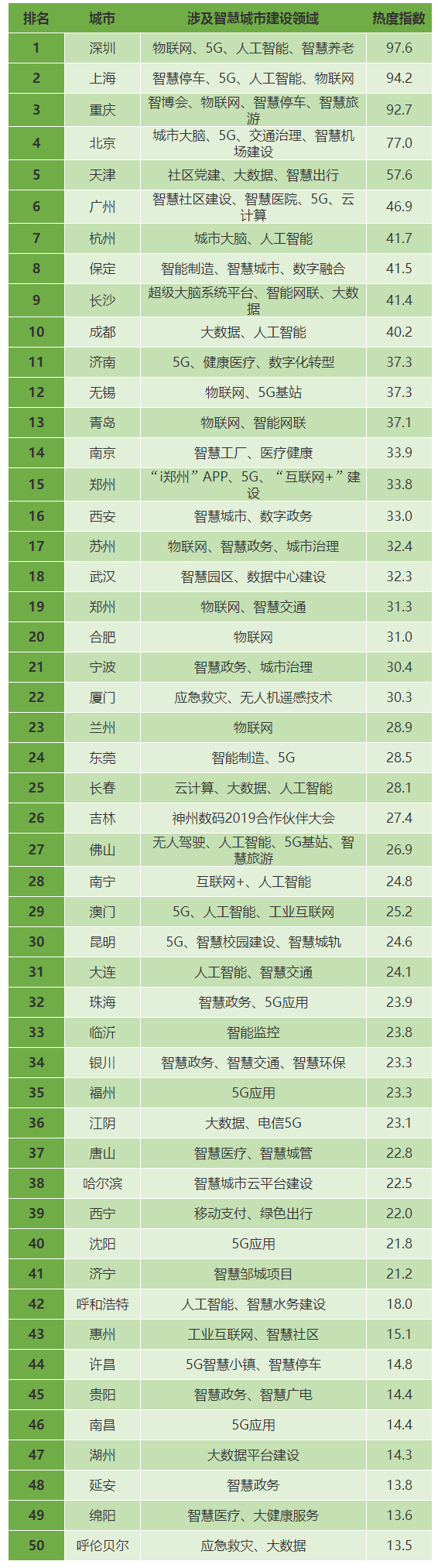 通过对有关“智慧城市”及其相关领域的的资讯进行统计梳理,新京报智慧城市研究院按传播热度列出罢翱笔50的城市。