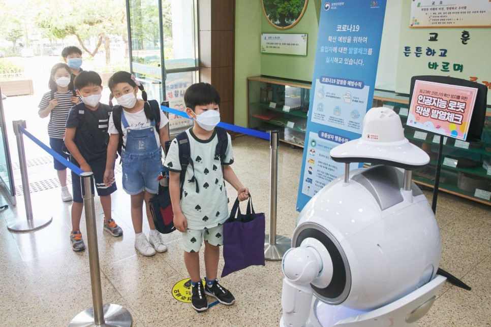 2020年6月,韩国首尔瑞草区政府在其辖区内51所小学、初中、高中部署Cruzr测温防疫机器人,Cruzr(克鲁泽)不仅承担防疫工作,高效测温,提醒学生正确佩戴口罩,减少教师工作负担,助力学校复学, 同时因为富有动感和生动表情,能够快速融入校园生活,成为学校的新成员。