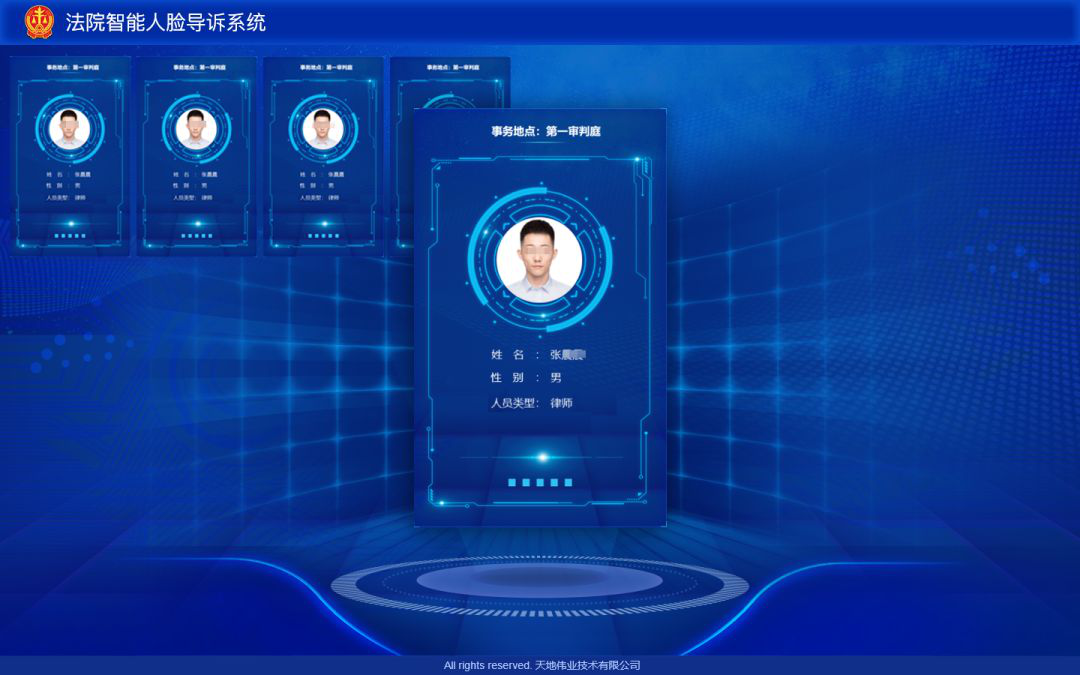 天地伟业以人脸识别为基础技术支撑,针对法院出入口、诉服大厅出入口、诉服窗口等不同的业务场景,以便民、智能、高效、安全为目标,构建了一套能够对诉讼服务中心进行有效分流、服务的智能导诉系统。