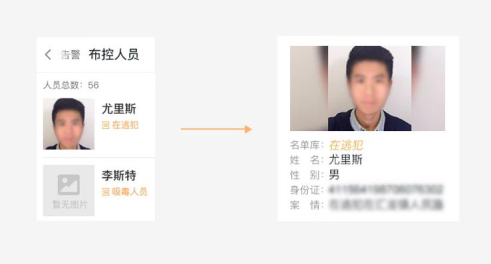 智能执法记录仪界面清晰展示布控人员列表,并可查看布控人员详情;