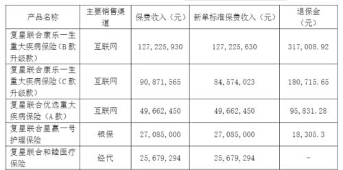 《每日经济新闻》记者注意到,该公司保费收入得以快速增长,互联网渠道销售的重疾险是当之无愧的“主力军”。年报显示,该公司2018年度保费收入居前五位的保险产物分别是“复星联合康乐一生重大疾病保险(叠款升级款)”、“复星联合康乐一生重大疾病保险(颁款升级款)”、“复星联合优选重大疾病保险(础款)”、“复星联合星赢一号护理保险”和“复星联合和睦医疗保险”。
