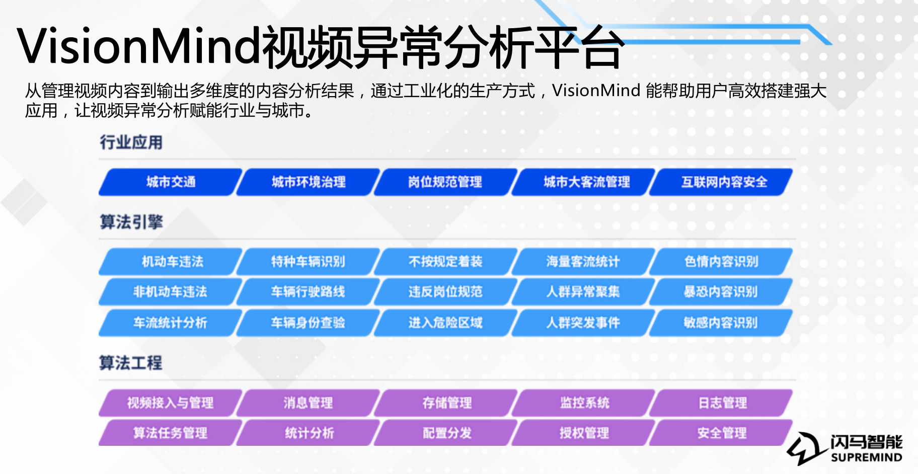 大赛上,闪马智能创始人兼CEO彭垚向评委详细介绍了闪马智能的视频异常分析平台 VisionMind 。通过接入运行的城市摄像头,VisionMind可以深度挖掘视频资源中的有效信息,其分析能力基于ATOM深度学习平台的工业化模型生产体系。闪马根据城市空间场景推出对应的“城市交通”“环境治理”“岗位管理”“客流管理”“内容安全”五大应用线,从而赋能到具有行业Know-How的完整运营体系中,截止目前,已有150+城区应用了闪马智能的视频异常分析产物。