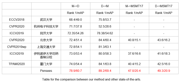 本次,澎思科技创新性地将对抗生成网络与自监督学习算法结合进行模型的训练,通过迁移学习,进行高准确率的跨场景(数据库)行人再识别算法的研发,取得了突破性进展,对于行人再识别技术在应用场景中的落地具有重要的意义。