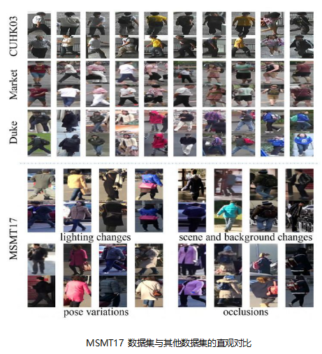 此次澎思科技刷新的ReID三大数据集,除了Market1501,DukeMTMC-reID两大常见数据集之外,还包含了MSMT17数据集。MSMT17,即Multi-Scene Multi-Time,是在CVPR 2018上提出的一个更接近真实场景的大型数据集,涵盖了多场景多时段,是目前最赋有挑战性的综合跨场景大数据集。与之前的数据集相比,该数据库中行人和摄像头数目更多,覆盖场景更复杂,时间跨度更广。因此,在该数据集下模型的表现更能体现出算法的实力。
