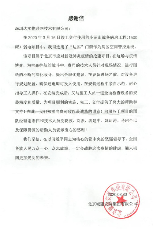 近日,我们又收到了一封表扬信,来自北京城建安装集团有限公司,负责北京小汤山备战病房工程弱电项目,项目中达实提供病区空间管控系统。信中表示: