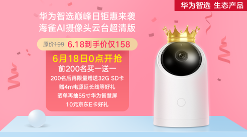 正值618大促,海雀AI摄像头云台超清版为回馈用户购机热情,更带来多重好礼。这款原价199元的华为智选居家安全好物,京东商城到手价仅需158。6月18日0点开抢,前200名下单还可买一送一。200名之后再限量赠送32G SD卡、4m电源延长线等好礼。