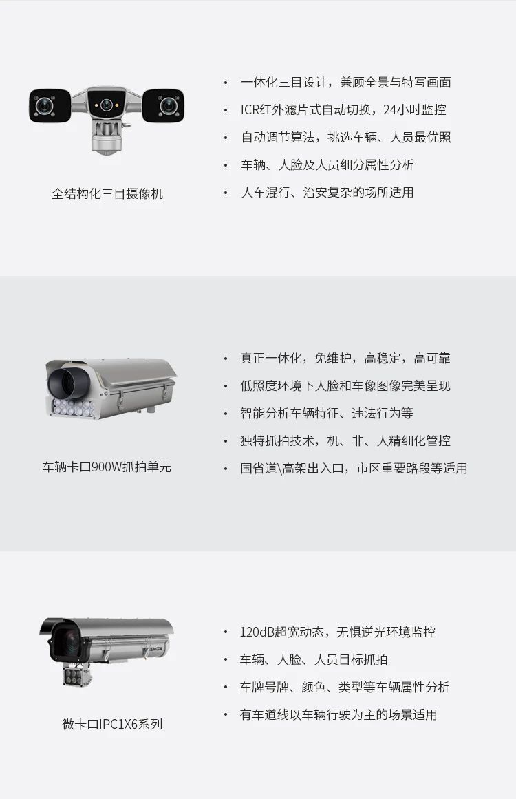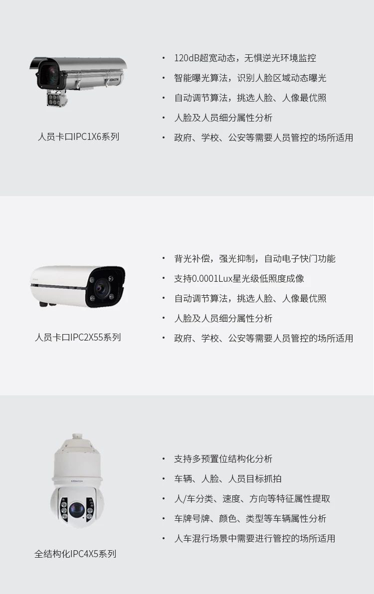 第叁代感知型摄像机品类包括人员卡口、车辆卡口、全结构化、微卡口等,场景适应广泛,满足各类型客户需求。